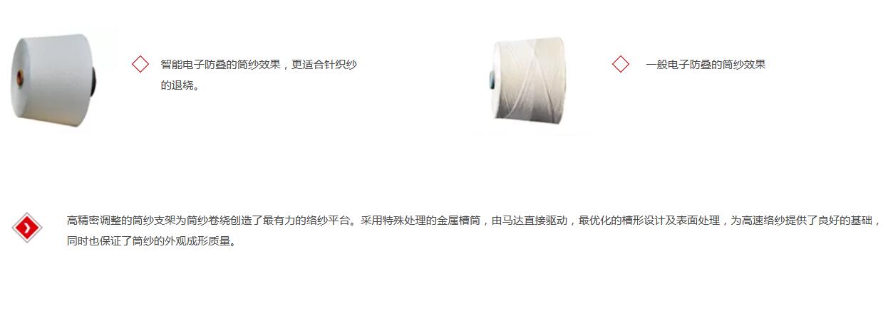 電子清紗器檢測頭更具主機(jī)參數(shù)設(shè)定可以全程監(jiān)控保證紗線的質(zhì)量,檢測所有的疵點(diǎn)并自動清除,使紗線質(zhì)量更加完美。智能閉環(huán)張力控制,保持恒定的卷繞密度,保證了紗線張力的一致性。對紗線張力的精確控制可以達(dá)到最高的卷繞速度,并保證紗線及筒子的優(yōu)越質(zhì)量。