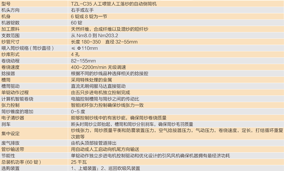 TZL-C35 型自動倒筒機(jī)是專門針對織布和針織用筒紗剩紗提供的專業(yè)、高效解決方案,由我公司自主研發(fā)設(shè)計。TZL-C35 型自動倒筒機(jī)繼承了完美的絡(luò)筒工藝和廣泛的品種適應(yīng)性,采用優(yōu)化的紗路和先進(jìn)的電子信息控制技術(shù),智能化控制的捻接循環(huán),通過電氣控制取代機(jī)械傳動,設(shè)備結(jié)構(gòu)簡潔,實(shí)現(xiàn)了筒紗剩紗的自動化處理,節(jié)約人工,生產(chǎn)高效。