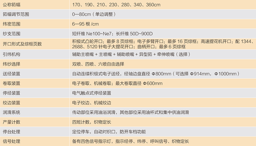 該機采用模塊組合式設(shè)計概念,高剛性的機架,加寬的箱型墻板,獨特的打緯平衡機構(gòu),精確的引緯控制技術(shù),造就一款高速、低振動、節(jié)能和智能化的新型噴氣織機。